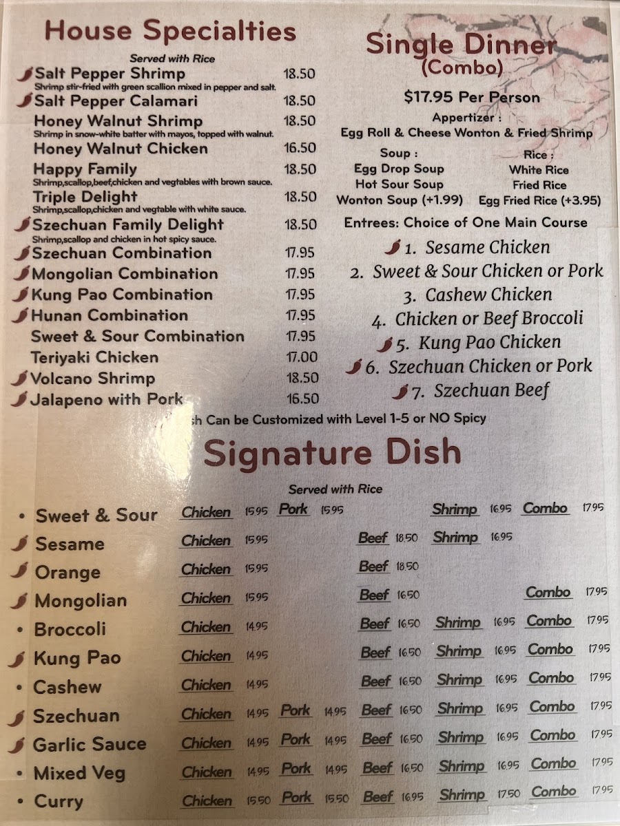The menu features a variety of dishes that cater to every palate. Indulge in their sweet-and-sour chicken and spring rolls, both praised for their delightful flavors. For those seeking heat, the Szechuan beef delivers a satisfying kick while maintaining a balance that doesn’t overwhelm. For beverage lovers, don’t miss the Brown Sugar bubble tea, a delightful pairing to any meal.